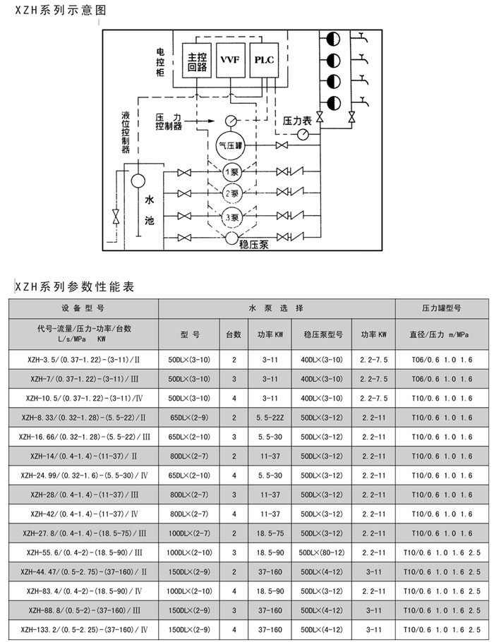 對于帶氣壓罐XZH型給水設(shè)備,可實(shí)現(xiàn)正常用水量時(shí)由消防泵定時(shí)輪換、恒壓變量供水,夜間小流量時(shí),由氣壓罐保持管網(wǎng)壓力。由于氣壓罐具有一定的消防貯水量,故更適于消防栓和自動控制噴灑滅火系統(tǒng)。