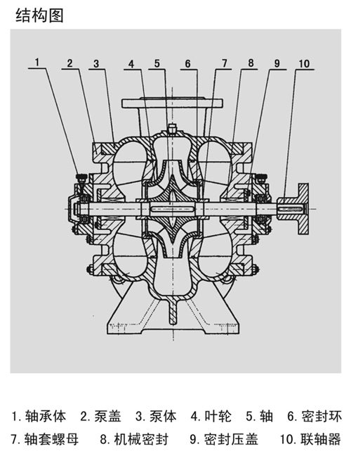 2本型泵的轉子是支撐在左右兩個軸承體上卸下兩邊軸承體及泵蓋即可分體,即屬前或后開門式結構,其優點是檢修方便,檢修時不動泵體及管路系統,只要脫開聯軸器及泵蓋即可取出葉輪等部件進行檢修(見結構圖)。